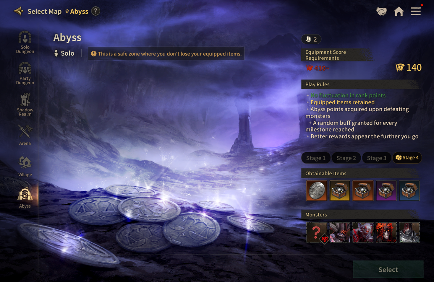 • The Abyss Dungeon will only be available during specific periods of time. These periods vary by server.